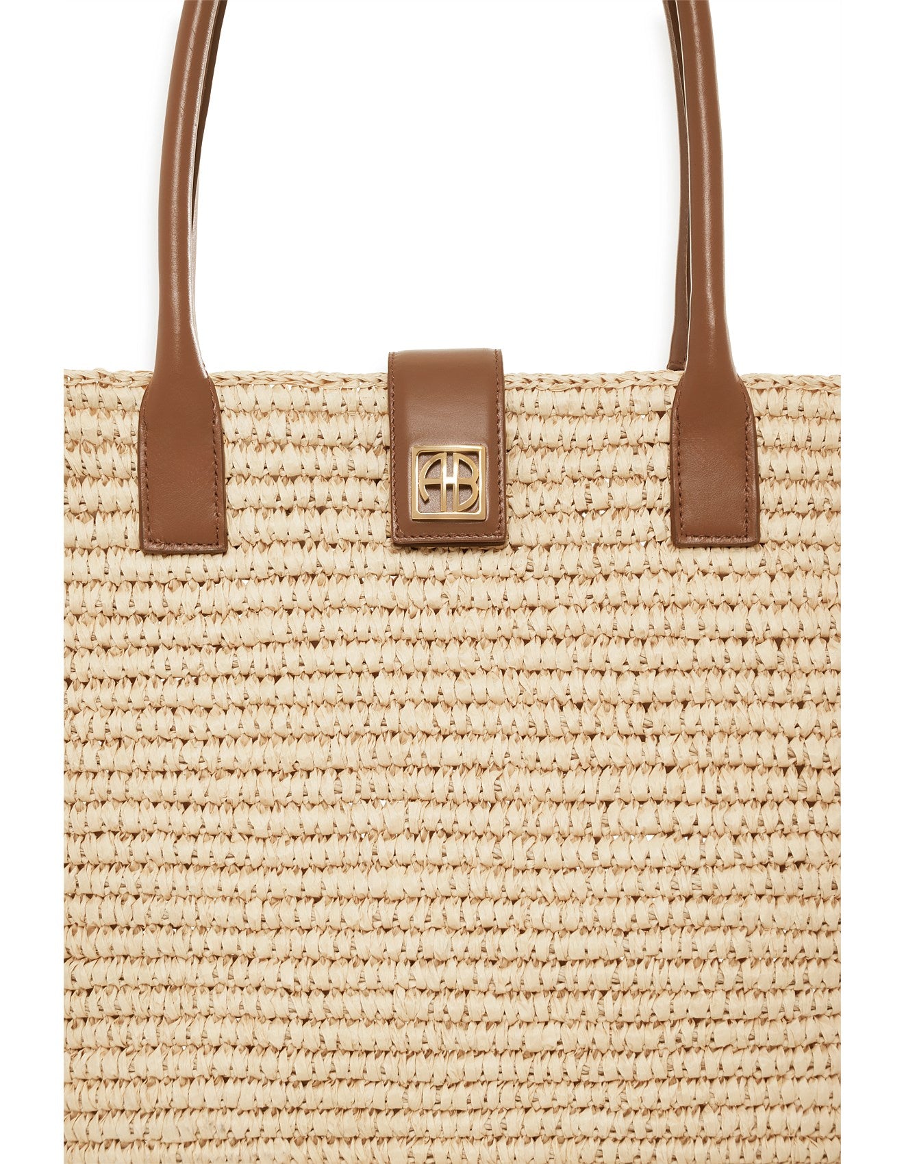 A modern vacation tote made from an unlined woven seagrass material with cognac leather accents. This item is handmade using natural and artisanal materials.